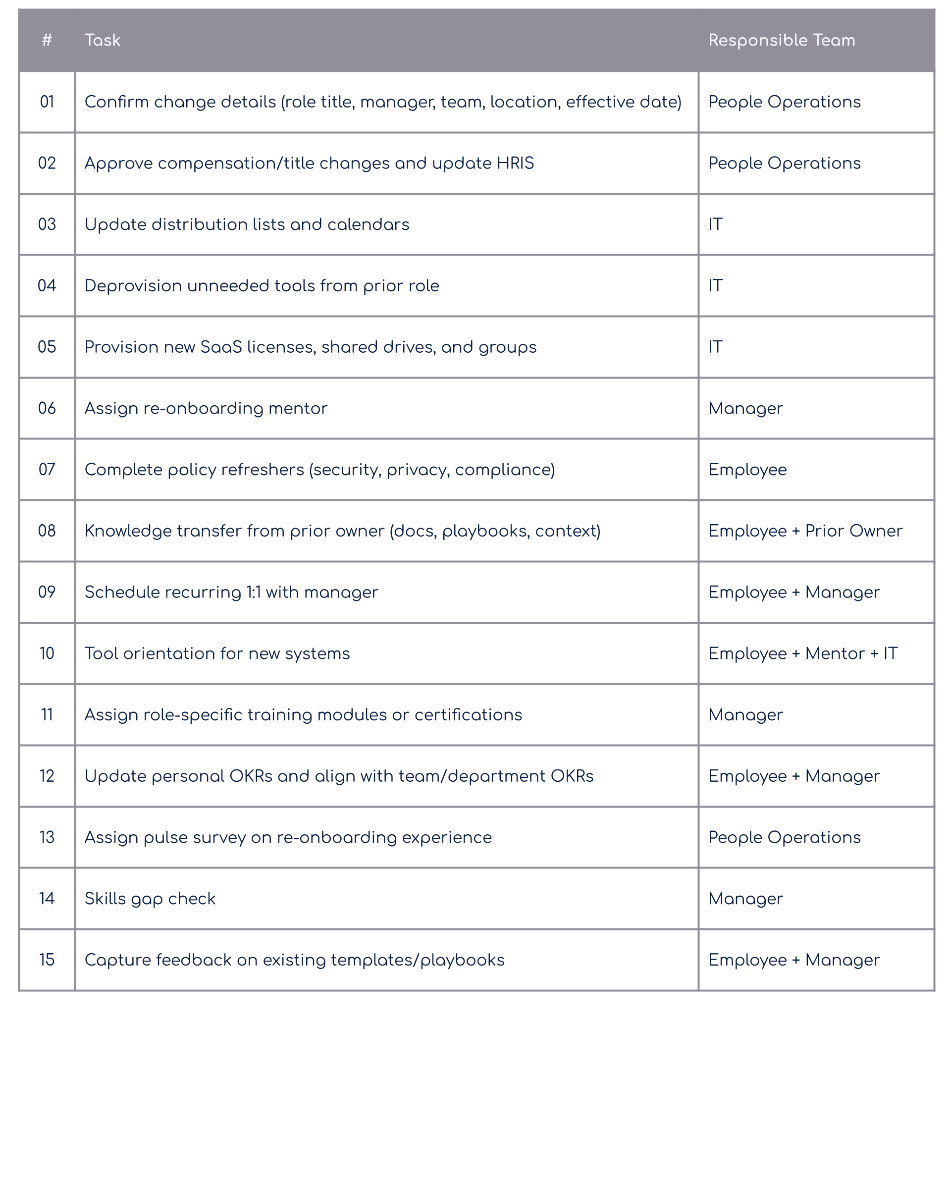 Re-onboarding is a focused reset that closes knowledge gaps quickly and helps employees adjust to new roles and responsibilities. This intentional alignment helps reduce uncertainty and gives employees the necessary context to perform effectively by setting clear expectations and providing necessary resources for training or upskilling.